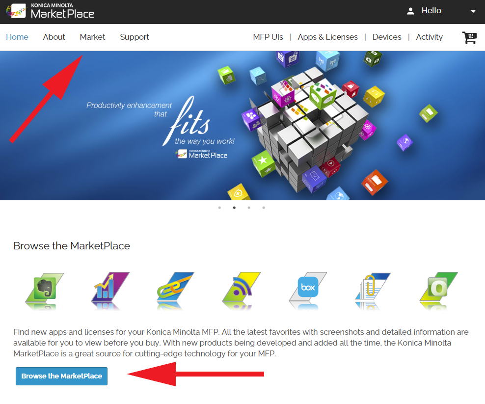 在柯尼卡美能达MarketPlace,您可以浏览,购买,安装和管理各种应用和许可证。 请执行以下操作: