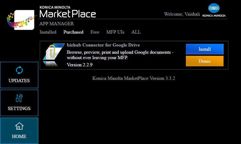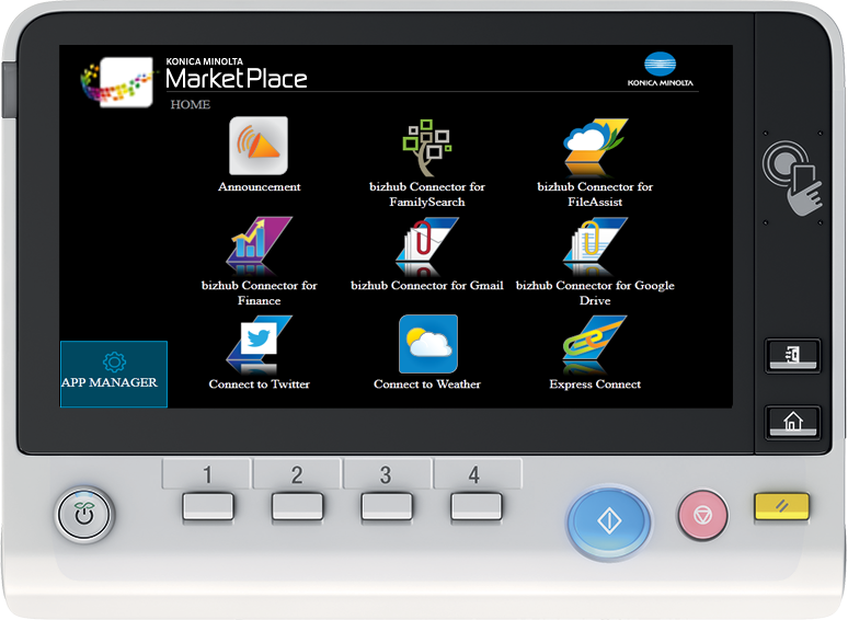 通过MFP的控制面板可轻松获取柯尼卡美能达MarketPlace应用和个性化MFP UI。平台集成了您日常办公离不开的多款应用和服务。MarketPlace提供最新的尖端技术,可以帮助您扩展MFP的功能。 在MFP上安装柯尼卡美能达MarketPlace后,只要点击MarketPlace图标即可快速体验。