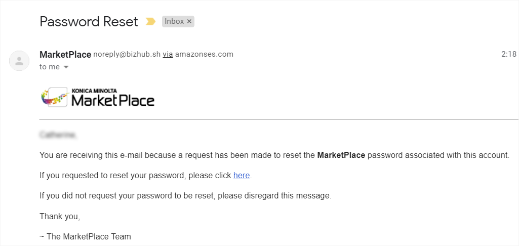 重置密码的链接将自动发送至您的电子邮箱。点击链接,设置新的密码。 有关重置密码的电子邮件示例,请参阅下图: